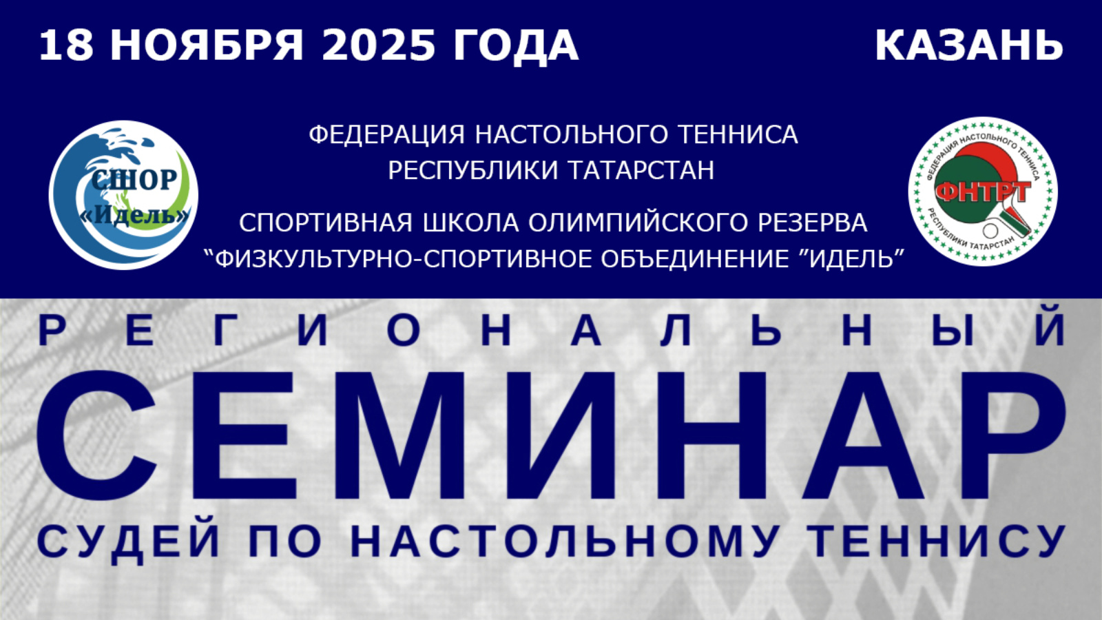 Во время проведения соревнований «Первенство Республики Татарстан до 20 лет и Кубок РТ» Федерация настольного тенниса Республики Татарстан совместно со Спортивной школой олимпийского резерва "Физкультурно-спортивное объединение "Идель" проводит региональный судейский семинар. В программу входят теоритические занятия «Работа судьи у стола» и сдача квалификационного зачета на присвоение и подтверждение 1, 2, 3 судейской категории. Преподаватели семинара – Шульга Г.П., Филиппов В.В.