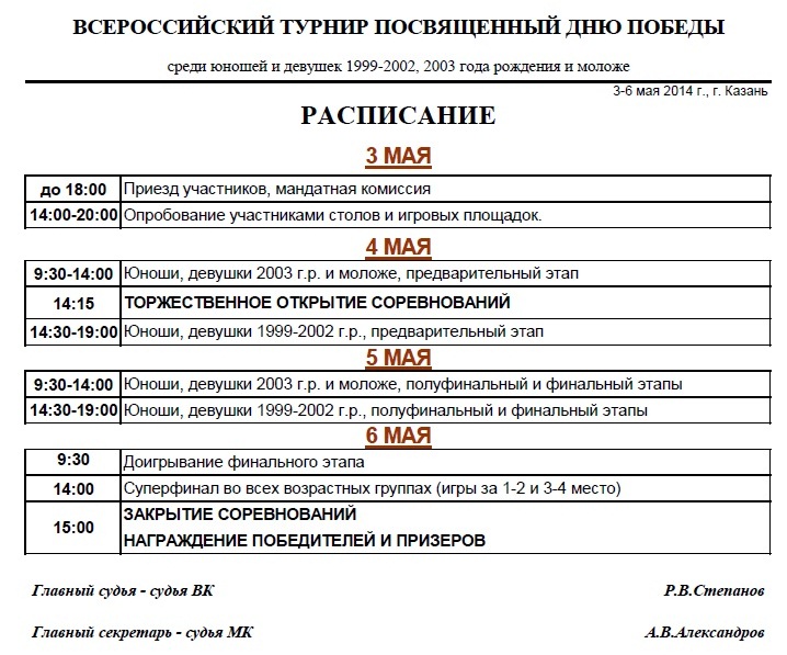 Расписание турнира, посвященного Дню Победы в ВОВ можете скачать здесь