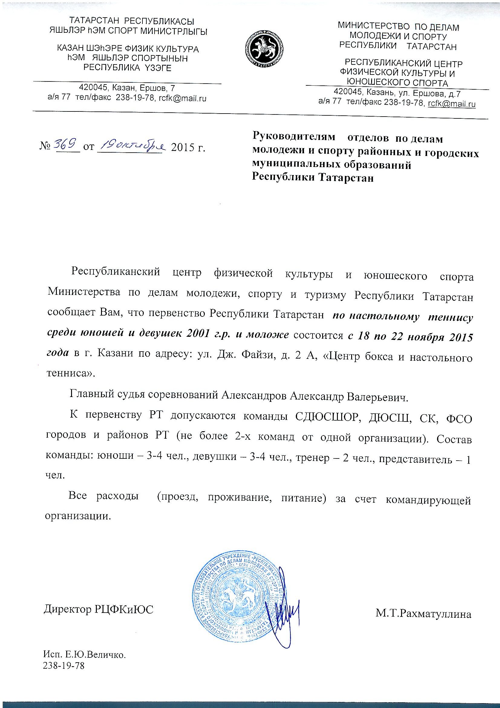 Республиканский центр физической культуры и юношеского спорта Министерства по делам молодежи и спорту Республики Татарстан сообщает Вам, что первенство Республики Татарстан по настольному теннису среди юношей и девушек 2001 г.р. и моложе состоится с 18 по 22 ноября 2015 года в г. Казани по адресу: ул. Дж. Файзи, д. 2 А, «Центр бокса и настольного тенниса».