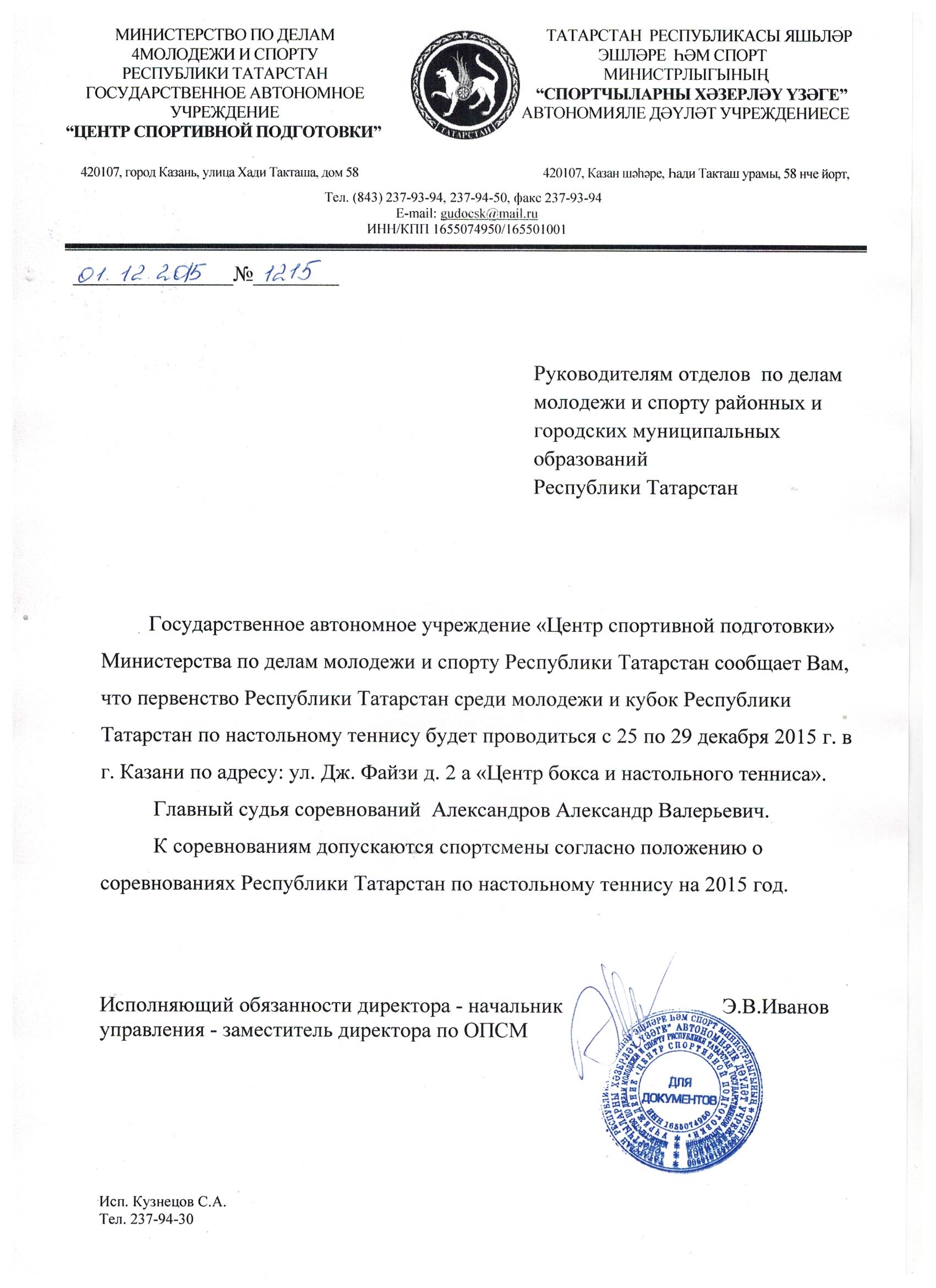 Государственное автономное учреждение «Центр спортивной подготовки» Министерства по делам молодежи и спорту Республики Татарстан сообщает Вам, что Первенство Республики Татарстан среди молодежи и Кубок Республики Татарстан по настольному теннису будут проводиться с 25 по 29 декабря 2015 года в г.Казани по адресу: ул.Дж.Файзи 2а «Центр бокса и настольного тенниса».